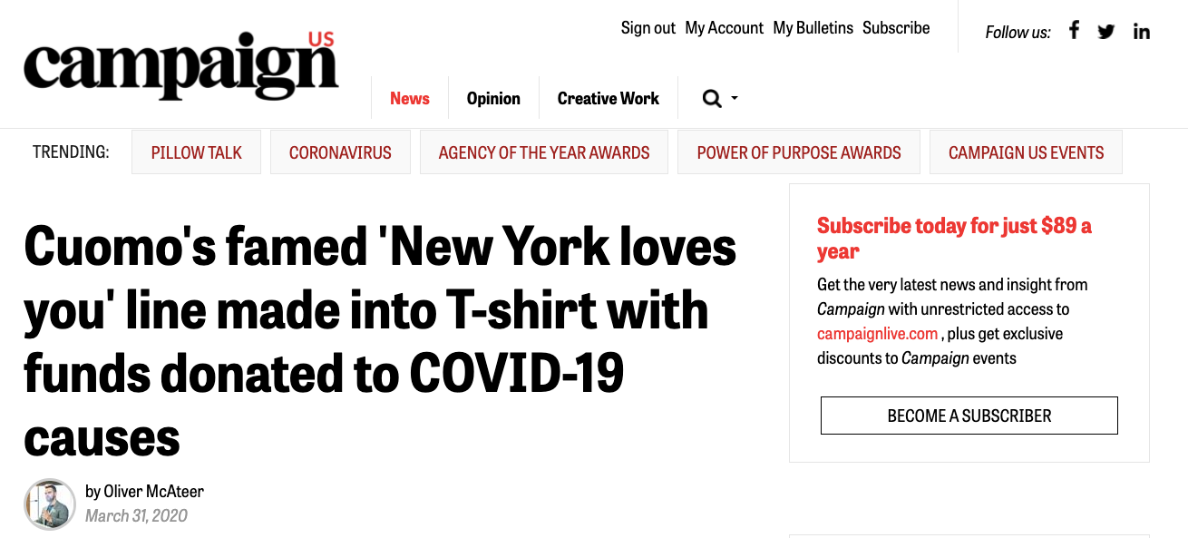 An article featuring the NY Loves U project I did with my partner, Trish Schmitt, which helped raise over $10,000 to get PPE to the first responders who needed it at the beginning of Covid-19.